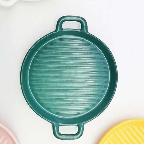 SYL Nordic Style Keramik Runde Platte mit zwei Ohren Backblech Pfanne Mikrowelle Backofen Reis Abendessen Gerichte